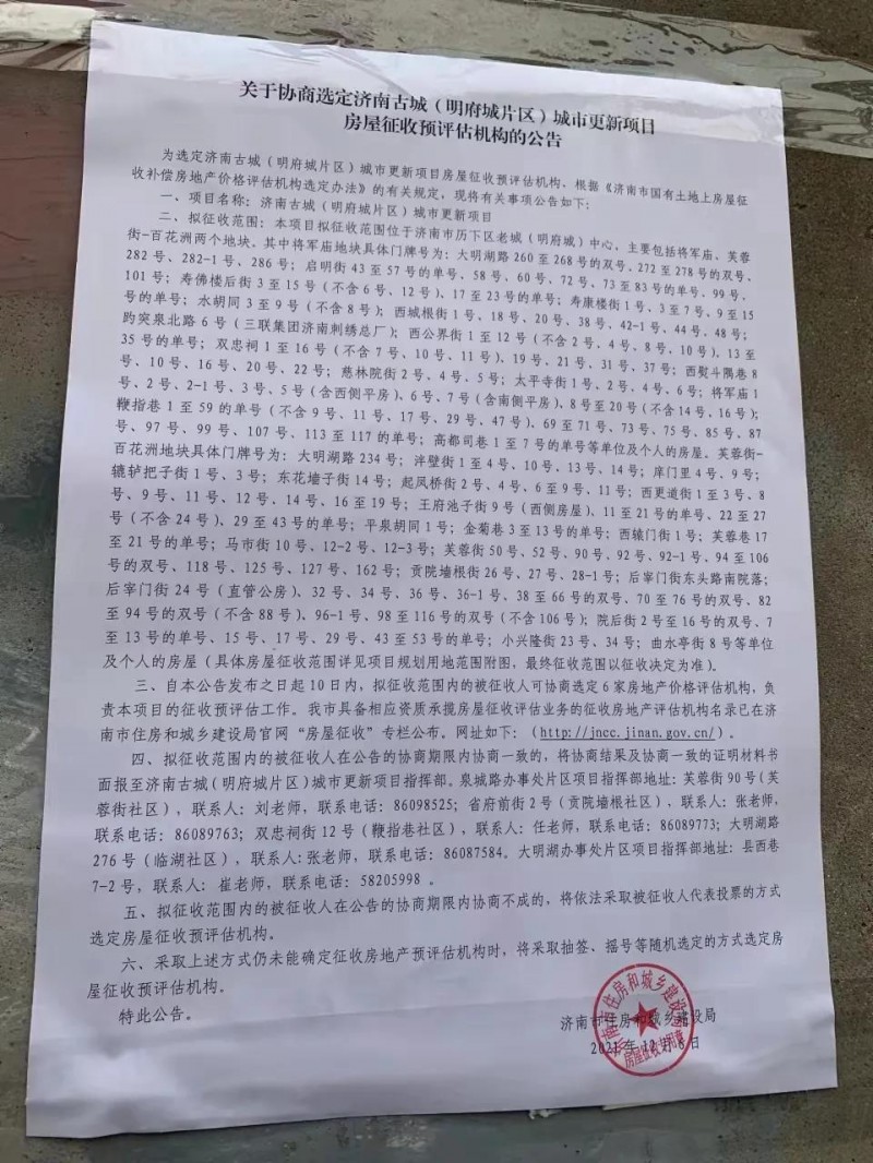 6日下午,历下区住建局已在项目拟定征收范围内组织张贴了协商选定预评估机构公告。此前,12月5日下午,在泉城路街道办事处召开了明府城城市更新项目工作推进会,参会各部门、街道办事处汇报了项目整体进展情况,商讨了指挥部迁移、张贴协商选定预评估机构公告等相关事宜,安排部署了下一步工作。